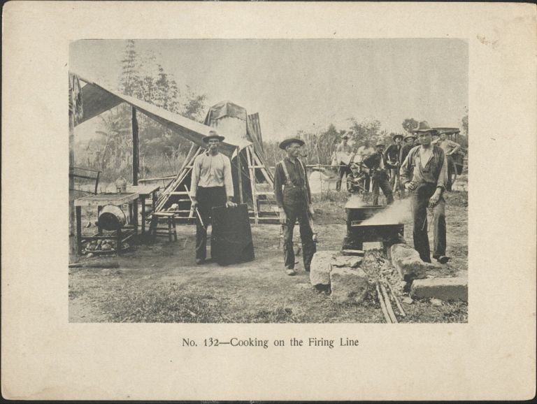 Subject: U.S. soldiers stand around the camp's kitchen, with large kettles boiling over the fire. Givens was the post photographer at the Presidio of San Francisco starting in 1899. In 190