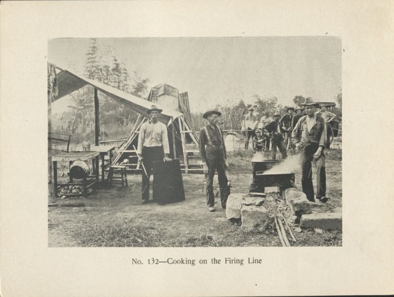 Subject: U.S. soldiers stand around the camp's kitchen, with large kettles boiling over the fire. Givens was the post photographer at the Presidio of San Francisco starting in 1899. In 190