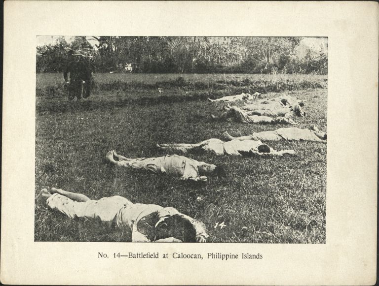 Subject: Dead Filipino soldiers laid out in a field near Caloocan. In the Battle of Caloocan (February 10, 1899) American troops under General Arthur MacArthur captured the town of Calooca