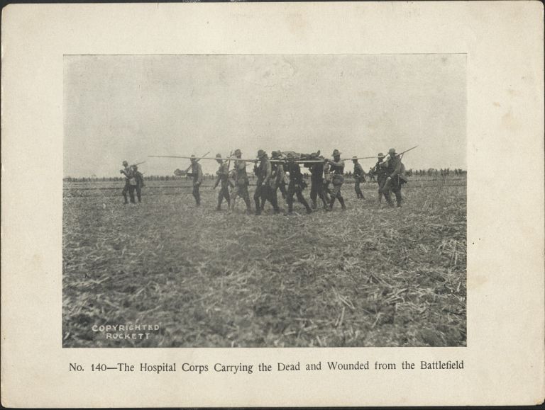 Subject: U.S. soldiers cross a field carrying a wounded comrade on their shoulders using a makeshift litter. Givens was the post photographer at the Presidio of San Francisco starting in 1