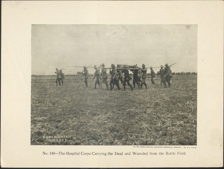 Subject: U.S. soldiers cross a field carrying a wounded comrade on their shoulders using a makeshift litter. Givens was the post photographer at the Presidio of San Francisco starting in 1