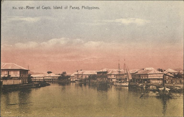 Subject: Large river or bay in Capiz Province, Panay Island, with ships docked and commercial buildings both sides.