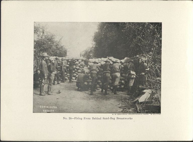 Subject: U.S. soldiers stand and fire rifles from behind wall of sandbags for protection. Givens was the post photographer at the Presidio of San Francisco starting in 1899. In 1900 he tra
