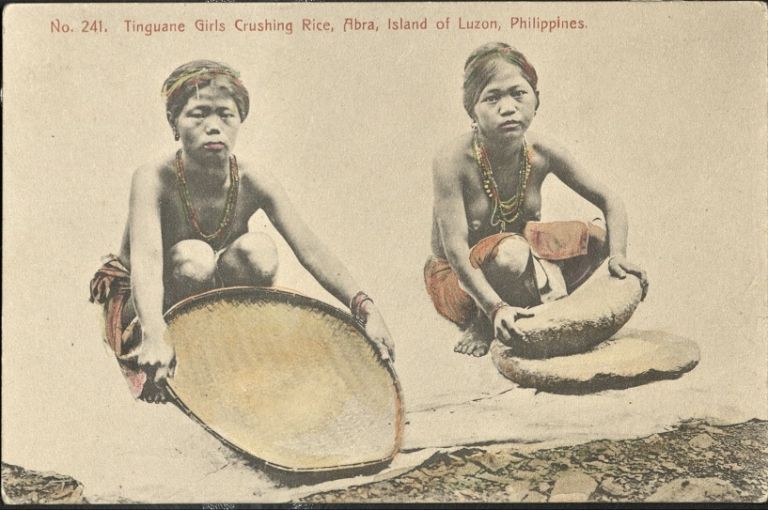Subject: Two young Tinguian women hulling and separating rice. The Tinguian are distinct from the Igorot tribe, their neighbors. Outsiders call them Tinguian but they call themselves �Itneg.�