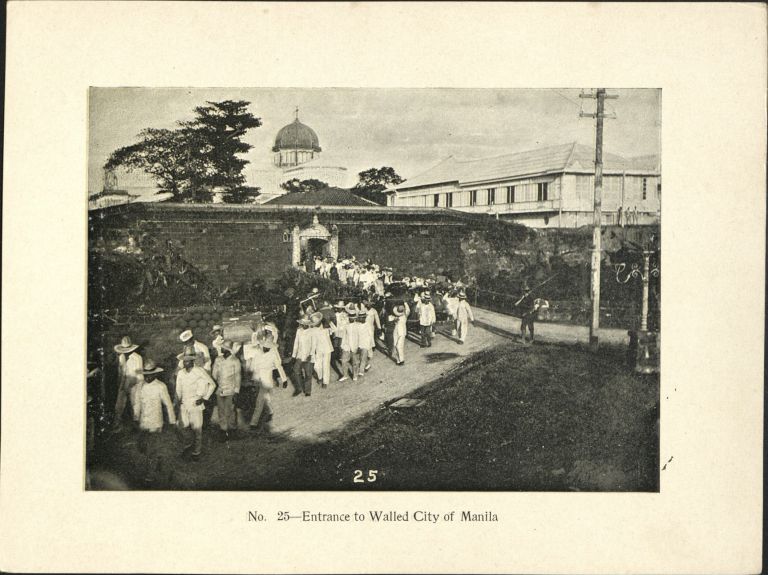Subject: Soldiers file out of a Intramuros gate under guard, with the dome of Manila Cathedral visible over the city walls. Givens was the post photographer at the Presidio of San Francisc