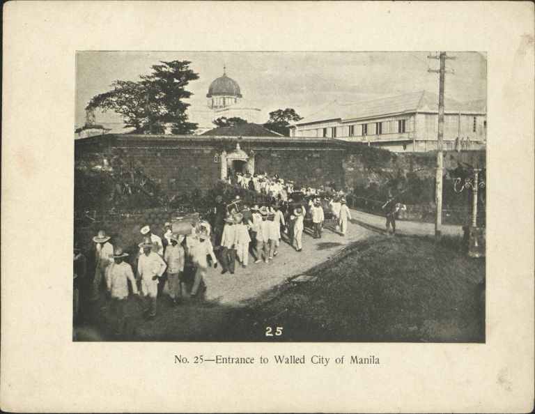 Subject: Soldiers file out of a Intramuros gate under guard, with the dome of Manila Cathedral visible over the city walls. Givens was the post photographer at the Presidio of San Francisc