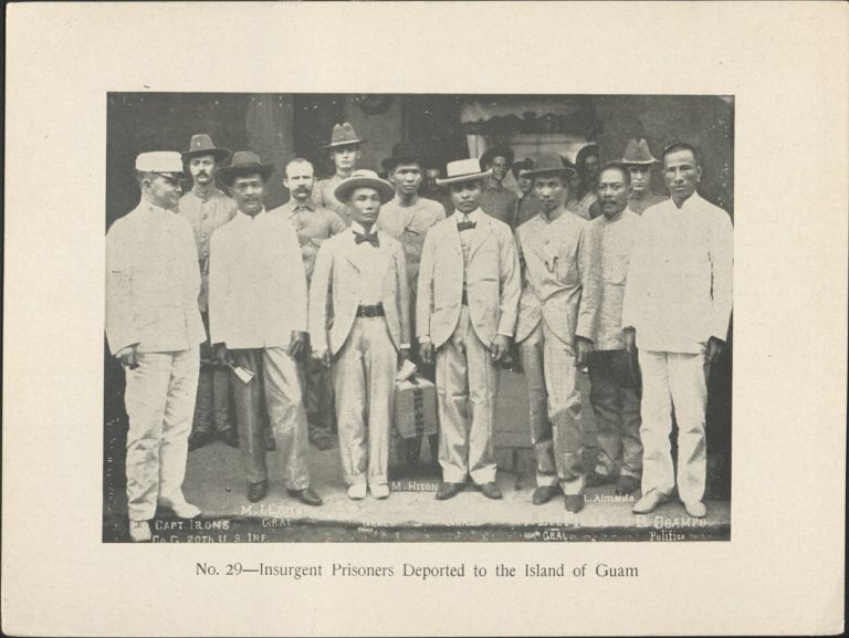 Subject: Seven Filipino insurgent "agitators" pose before American soldiers. Some are named. The U.S. continued Spain�s practice of exiling unwanted and undesirable Filipinos to Guam and u