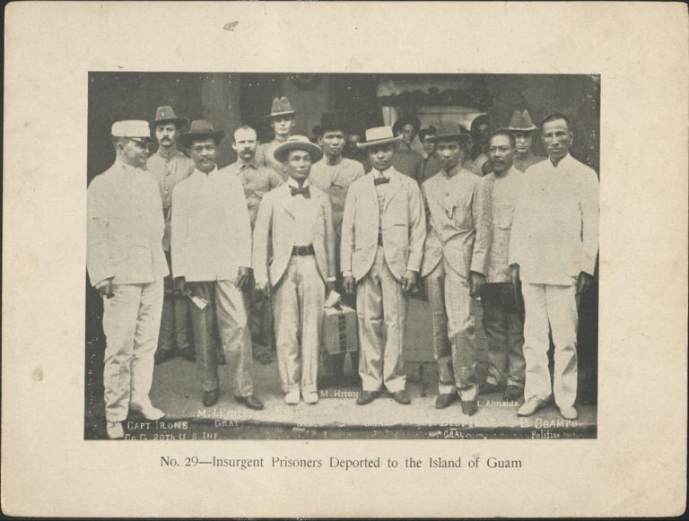 Subject: Seven Filipino insurgent "agitators" pose before American soldiers. Some are named. The U.S. continued Spain�s practice of exiling unwanted and undesirable Filipinos to Guam and u