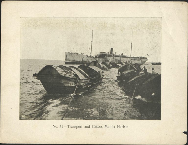 Subject: Rows of cascos (local Philippine barges) are being towed away from a U.S. Army transport ship anchored in Manila Bay. Givens was the post photographer at the Presidio of San Franc