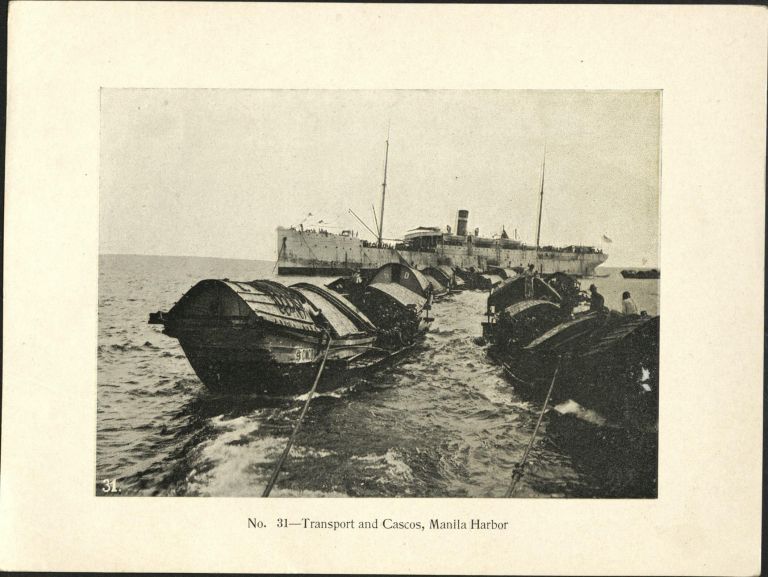 Subject: Rows of cascos (local Philippine barges) are being towed away from a U.S. Army transport ship anchored in Manila Bay. Givens was the post photographer at the Presidio of San Franc