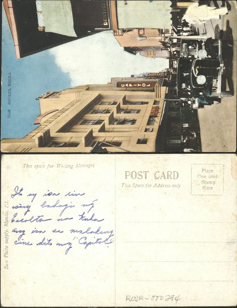 Subject: Escolta Street, Manila; 1920s automobiles and pedestrians along store fronts and Capitol theater.