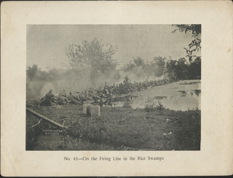 Subject: U.S. soldiers lie behind the muddy edge of a flooded rice paddy for protection while firing rifles. See also OFI-004111 for the same image as a real photograph. Givens was the po