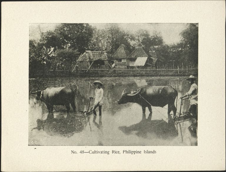Subject: Two men with carabaos harrowing a flooded rice paddy in preparation for planting. Same image as OFI-003077 but differently captioned. Givens was the post photographer at the Presi