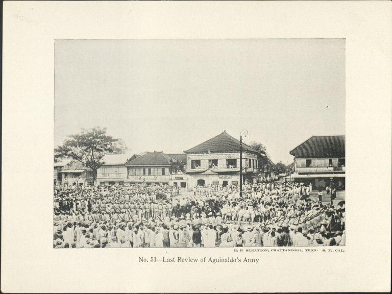 Subject: It's unclear whether this image was taken when the Filipinos were fighting the Spanish or Americans for independence. A mass of Filipino soldiers parade through a town plaza and f