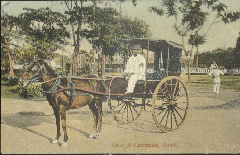 Subject: Man in two-wheeled coach (calesa) harnessed to horse near a park in Manila.