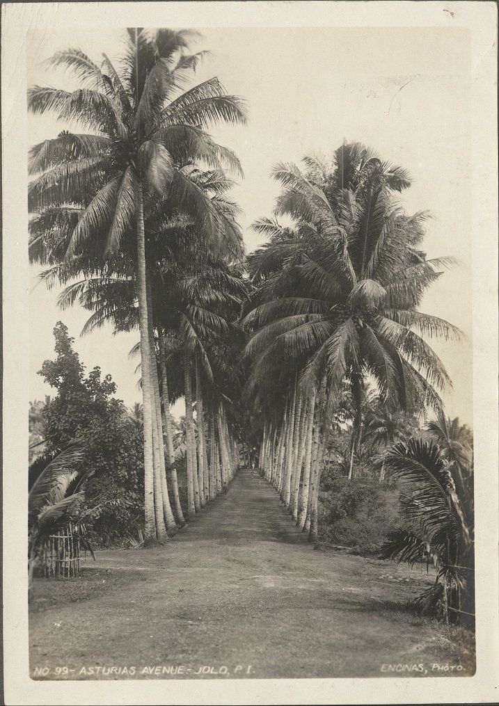 Subject: A common image from Jolo in the early 1900s is Asturias Road, or the "Avenue of Palms" in Jolo on the Sulu Archipelago. Coconut palms line both sides of a narrow raod in a beautiful effect.