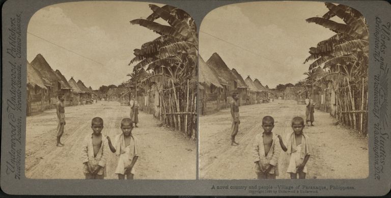 Underwood #U525. Two boys stand in road foreground; man and woman middle distance; nipa huts line road in Paranaque, Philippines.