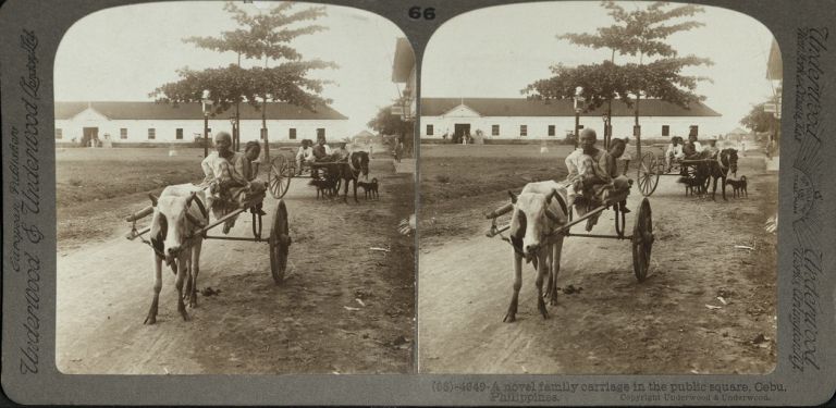 Underwood #U4649. Filipinos ride carts pulled by horses on street in Cebu.