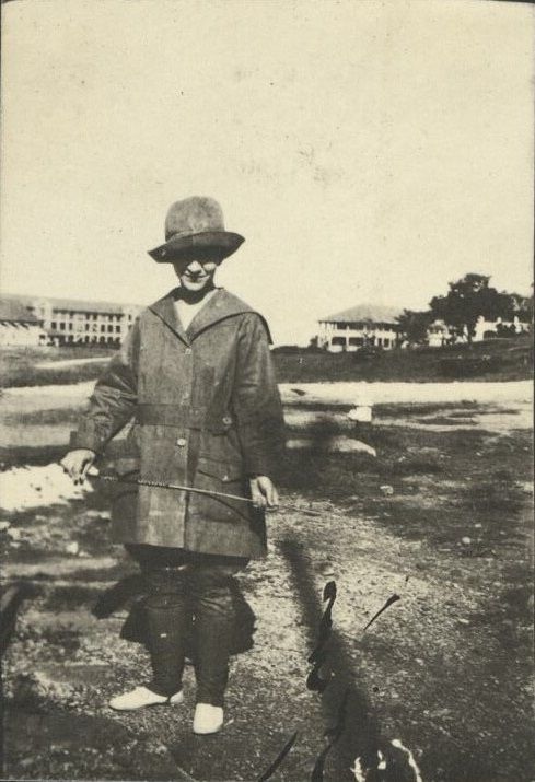 Subject: American woman, a military wife on Corregidor, bundled up for a wet hike. Buildings and quarters of Fort Mills, Corregidor in background.