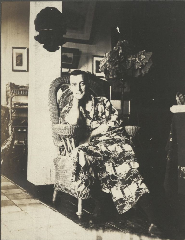 Subject: An expatriate man dressed in a kimono relaxes in a wicker chair in a sala, perhaps the same room as OFI-002393.