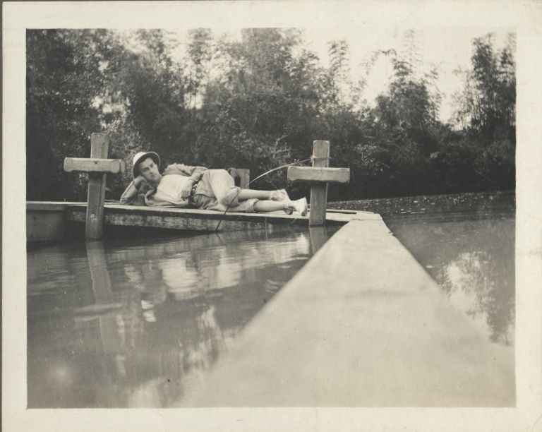 Subject: An expatriate man, possibly a rower (see OFI-002396) relaxes on a floating dock on the San Juan River, in San Francisco del Monte which is now part of Quezon City. See also OFI-002347 and OFI