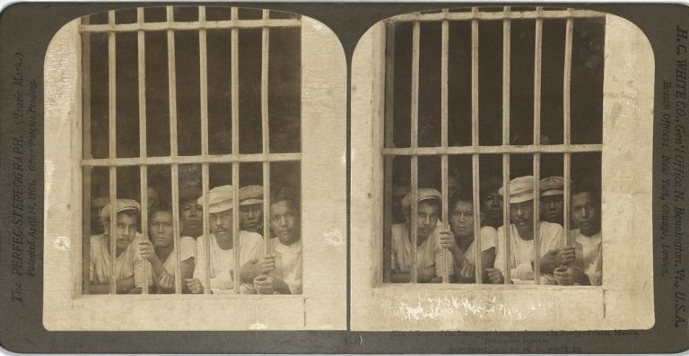 H. C. White #W3524. Filipino prisoners of war look out from behind bars in a window at a Manila prison.