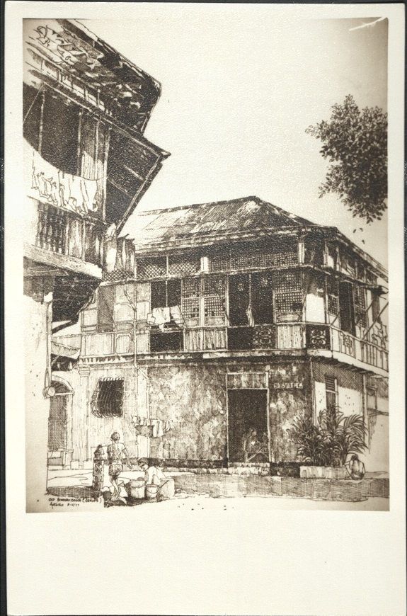 Subject: Street scene of large two-story traditional old houses in Binondo. Although not specified, these prints are similar to the postcards produced and sold b