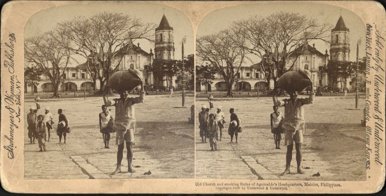 Old Church and smoking Ruins of Aguinaldo's Headquarters, Malolos, Philippines.