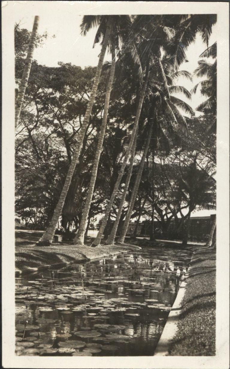 Subject: A canal or reflecting pool in shady trees, which must be at Fort Pilar in Zamboanga City near Pettit Barracks, a U.S. Army camp. Image appears to be the same location seen in OFI-001105. The