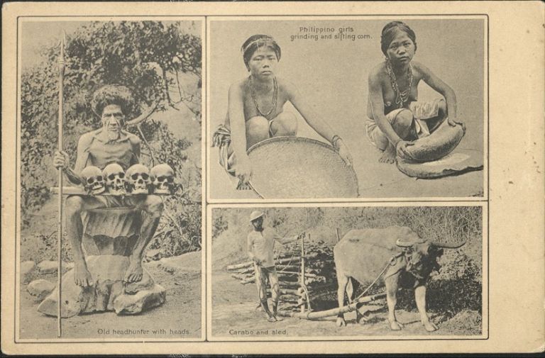 Subject: Three scenes: headhunter with skulls; Tinguian girls hulling rice; and carabao pulling a sled with bamboo poles.