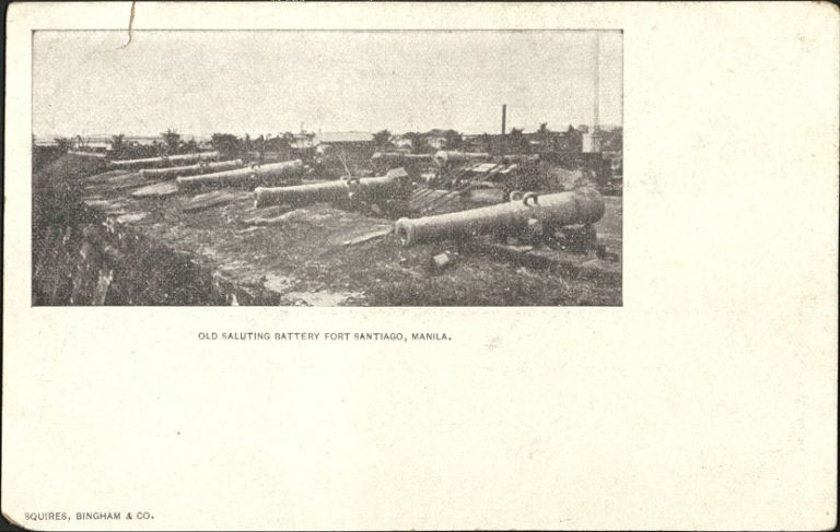 Subject: Several old Spanish cannons facing out from fortress walls of Fort Santiago, Manila.