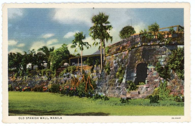 View of Intramuros exterior walls and one of the baluartes from grassy field of golf course outside.
