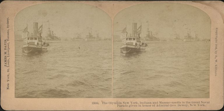 Kilburn #B13444. Warships of the Spanish-American War seen behind tugboat in New York Harbor during commemoration of Admiral Dewey's victory in the Philippines.