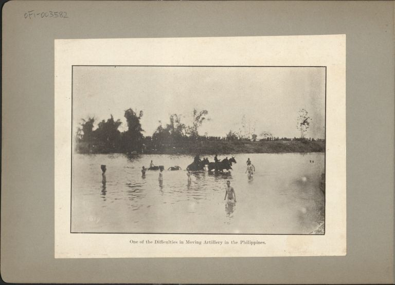 Subject: Team of soldiers on horseback ford a Philippine river pulling a cannon up to its wheel-tops in water; mass of soldiers on far bank. Givens was the post photograph