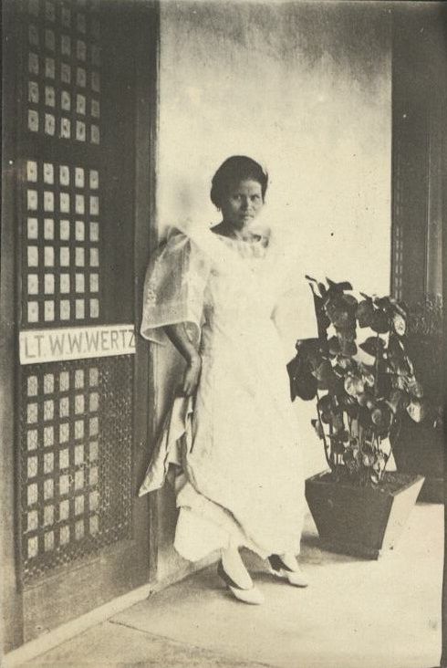 Subject: Francisca standing on a porch in a terno, a traditional Filipino dress for special occasions - in this case All Saints' Day, November 1. The name on the capiz-shell door reads Lt. W. W. Wetrz