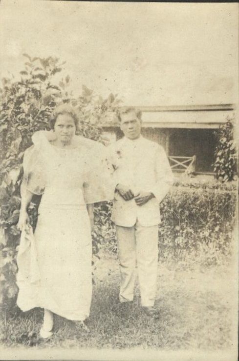 Subject: Francisca and Pedro, this family's household employees, pose next to a hibiscus plant on the grounds of Fort Mills, Corregidor Island.