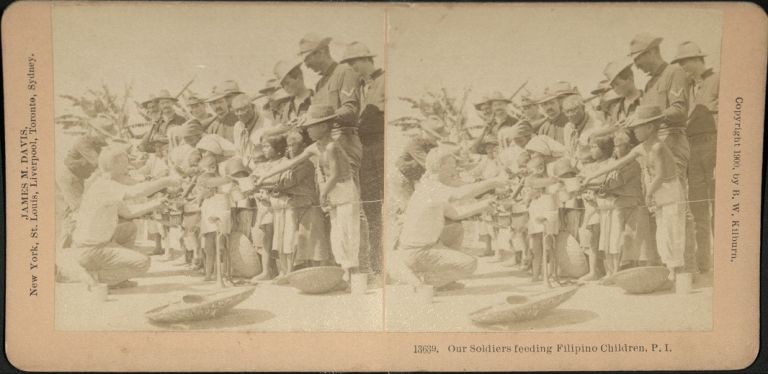 Kilburn #B13639. U.S. soldiers hand out food to Filipino children.