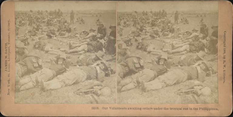 Kilburn #B13513a. U.S. soldiers stand, sit and lie at ease in a sunny field in the Philippines.