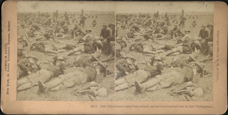 Kilburn #B13513b. U.S. soldiers stand, sit and lie at ease in a sunny field in the Philippines.