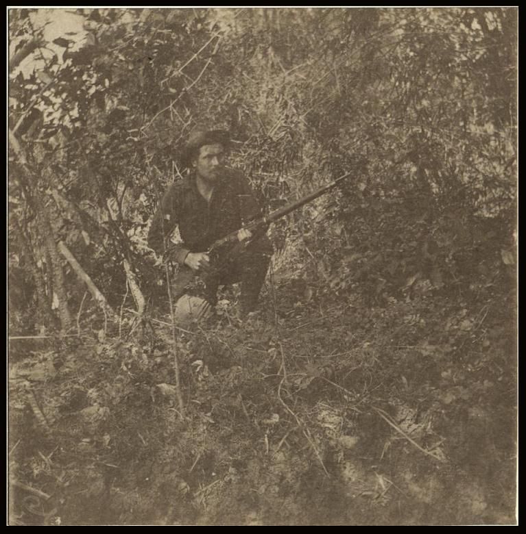 Subject: A U.S. soldier crouches in the brush at Calamba, site of an important battle in the Philippine-American War. "On July 26, 1899, an expedition under Brig. Gen. Robert H. Hall, attacked Calamba