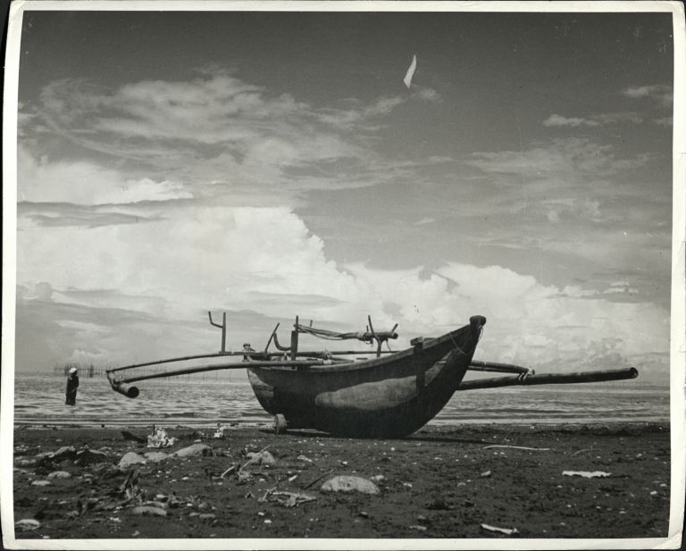An outrigger native boat on the coast of Aparri, Northern Luzon, where Japanese invaders were mopped up and near where a Japanese battleship went down.