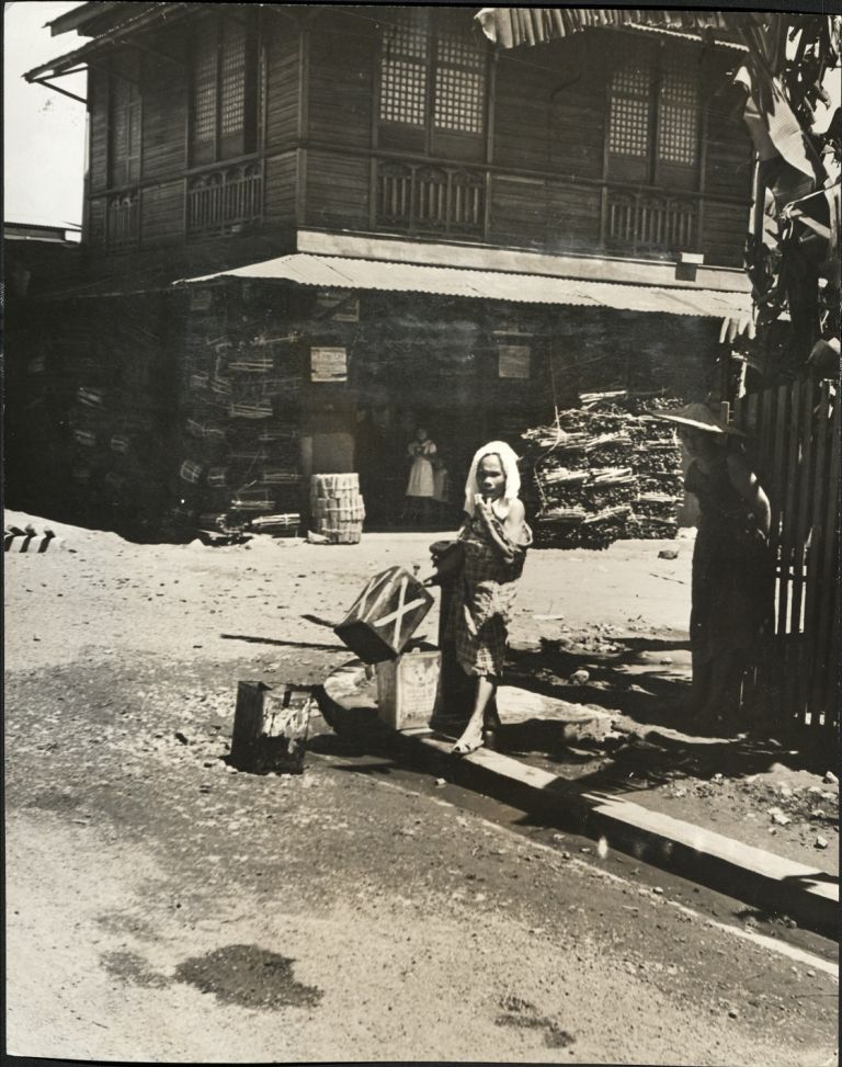 Subject: A Filipino woman stands on an Iloilo street corner filling metal cans from a water pump while other Filipinos look on from the shadows by the fence and the store in the background.