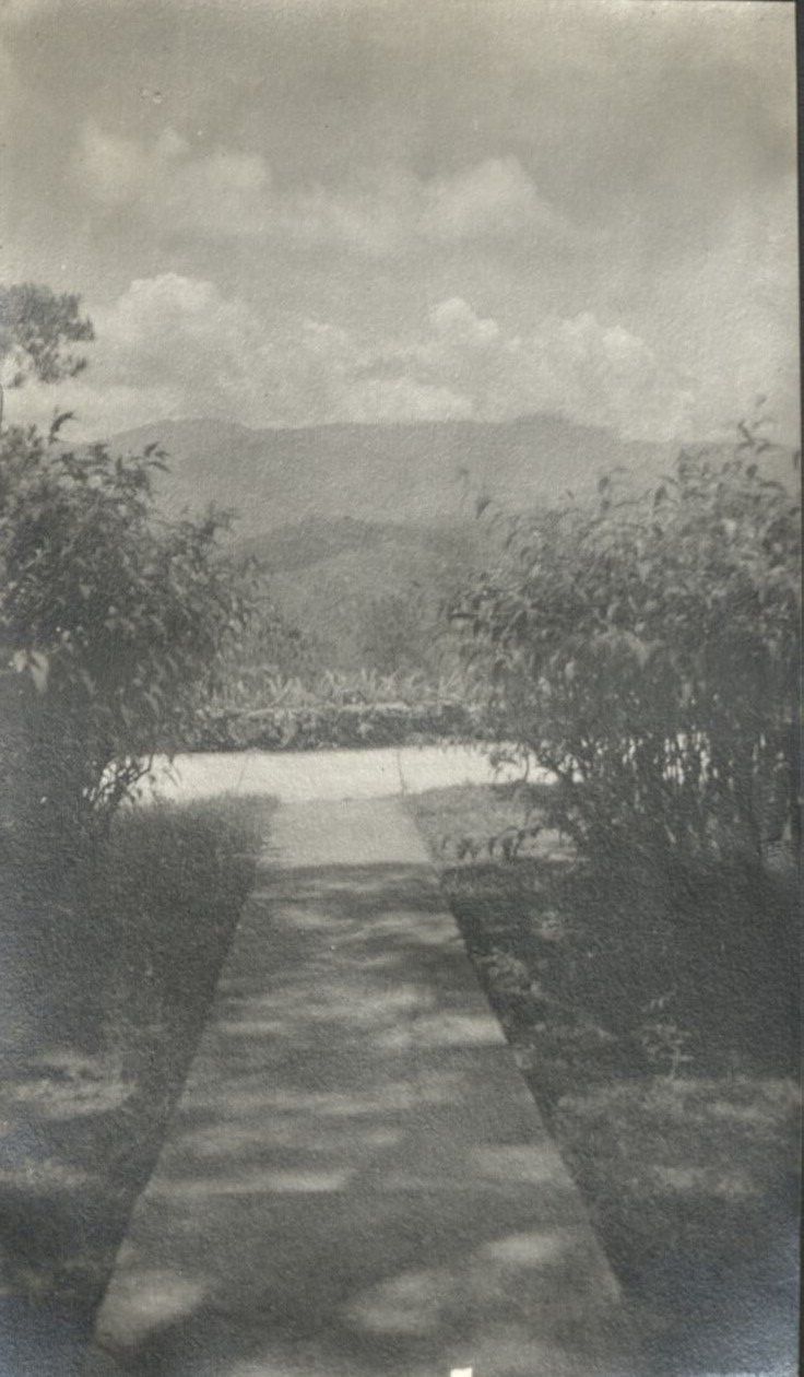 Subject: View down a concrete path to mountains beyond Camp John Hay in Baguio.