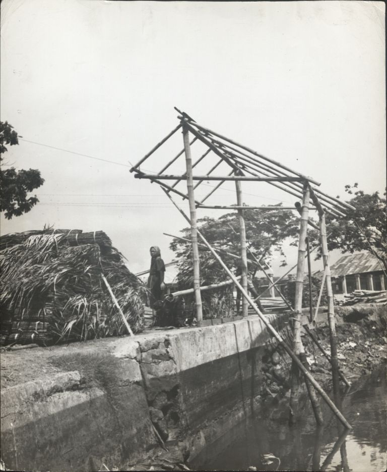 P 53b. A bamboo rack built on the edge of one of the canals in Manila helps the boatmen to unload their thatching, wood, and grain by sliding it up the bamboo poles from the rafts.