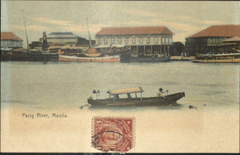 Subject: Small boat in Pasig River, other boats docked by buildings on far bank.