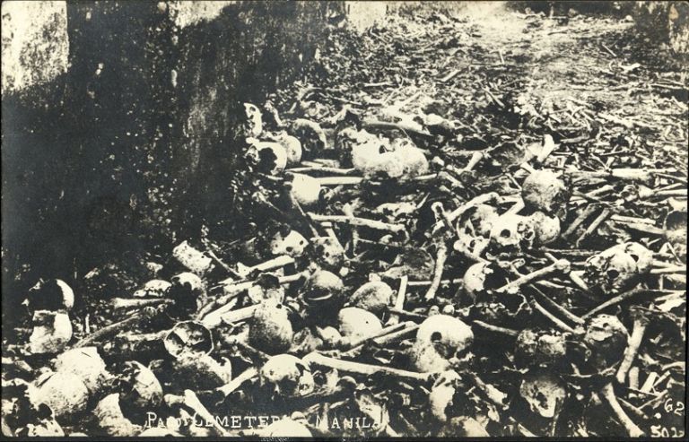 Subject: Piles of bones and skulls in Paco Cemetery (now Paco Park), Manila. Burial vaults were typicallly leased and re-used.