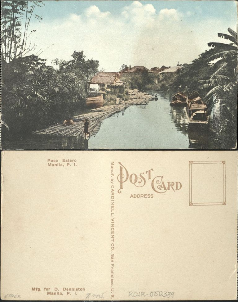 Subject: Bamboo rafts and boats on Estero de Paco, a canal or waterway in Paco, Manila, connecting to the Pasig River.