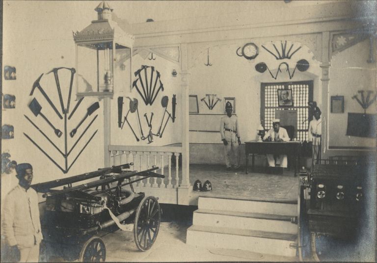 Subject: Interesting look at the interior of the Paco fire station circa 1900, which appears to double as a fire fighting museum, with displays of axes, shovels, hoses, lights and alarms, a