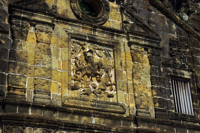 Subject: St. James stone carving on the pediment of Saint James the Apostle Parish Church, commonly known as Paete Church, in Paete, Laguna Province. "The church's facade is divided by a frieze that c