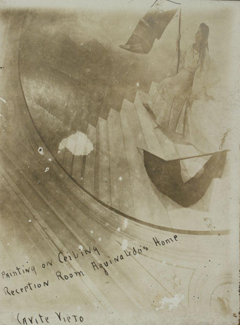 Subject: Painted ceiling mural of a woman holding a flag descending stairs at Emilio Aguinaldo's home in old Cavite. Perhaps this home is the same one seen in ROJR-000160.